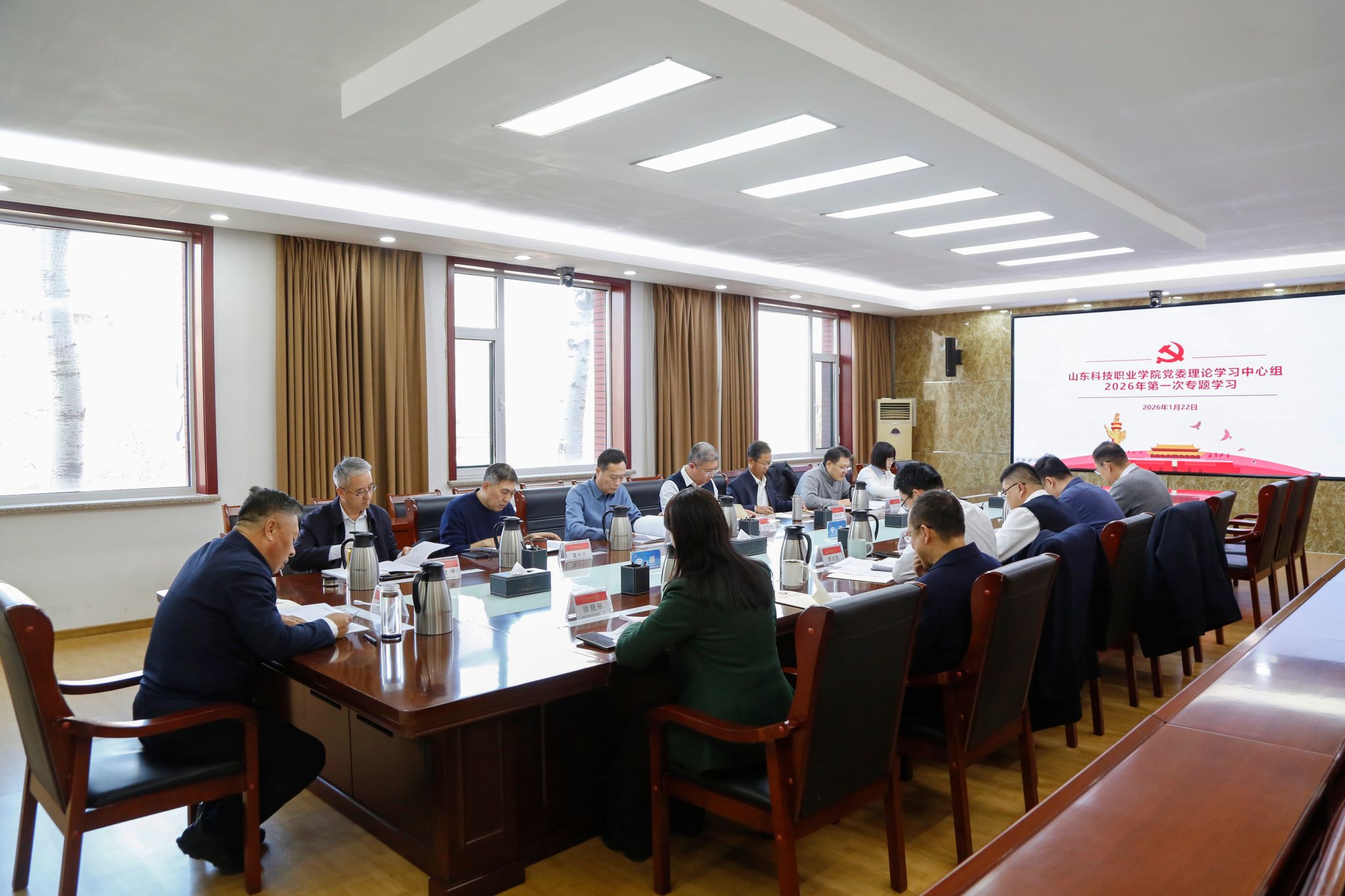 1月22日下午,学校党委理论学习中心组在办公楼第一会议室开展2026年第一次集体学习。学校党委书记郑德前主持学习并讲话,中心组成员出席会议并分别领学相关篇目。相关职能部门负责人参加集体学习。