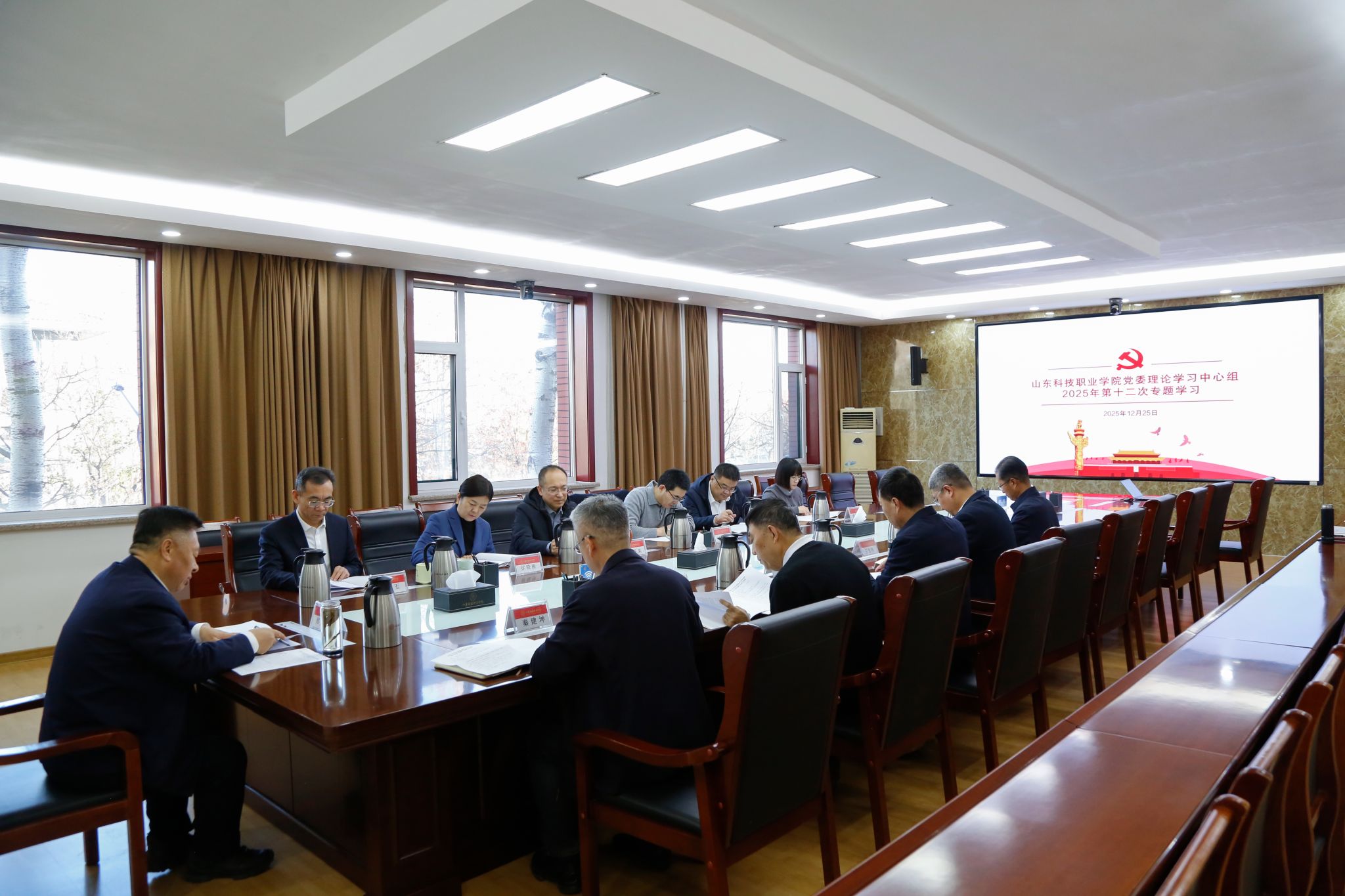 12月25日上午,学校党委理论学习中心组在办公楼第一会议室开展2025年第十二次集体学习。学校党委书记郑德前主持学习并讲话,中心组成员出席会议并分别领学相关篇目。相关职能部门负责人参加集体学习。